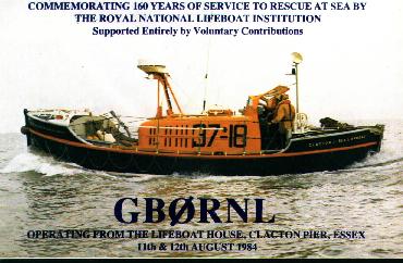The QSL card from the Special Event Radio Ham Station held in the Clacton Lifeboat House on the 11th 12th August 1984 Commemorating 160 Years of The Royal National Lifeboat Institution.