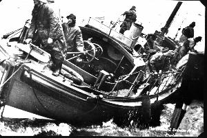 Nearly sixty years after the Albert Edward capsized, disaster again struck the Clacton Lifeboat, resulting in the loss of one of the crew. It was lunchtime on April 6th 1943, when the lifeboat was called out to the assistance of the barge Tam o'Shanter, which had a load of brick rubble for Maldon. When the lifeboat reached her she was anchored a mile and a half east of the Swin bell buoy. The skipper refused to leave the leaking barge and asked the coxswain to tow her into Brightlingsea, so second coxswain Frank Castle, assistant motor mechanic Arthur Liddiard and bowman A. Griggs were put on board the barge to help get the anchor up, the barge crew consisted only of the skipper and a boy. Forty minutes later the lifeboat took the barge in tow, but after she had towed the Tam o'Shanter only a mile and a half the towline parted and it was decided to anchor for the night to await a more favourable tide. During the night the wind and sea fell, and it seemed that the next day would be fine. In the morning, however, the wind increased again to an exceptionally strong gale from the west, with a heavy sea. Again the coxswain tried to persuade the skipper to abandon the 39 year old barge, but he refused and suggested the lifeboat should tow her to Harwich in view of the changed conditions. The tide was against them, so the two vessels remained at anchor until one in the afternoon. The lifeboat then took the barge in tow, but after getting her though the Swin Spitway the towline again parted, so the crew made sail on the barge and she went on her way, escorted by the lifeboat. Wind and sea were now almost abeam, and both lifeboat and barge were rolling heavily and shipping a good deal of water. "What's all this water ?" one of the lifeboatmen on board the barge asked as he heard water swilling about below. Suddenly the barge capsized, throwing the skipper, boy and the three lifeboatmen into the water. The lifeboat went at once to their aid, picking up Liddiard and Griggs, the crew managed to reach Frank Castle with the boathook but his oil skin tore and they lost him, he seemed to be either dead or unconscious. Liddiard had been supporting the skipper of the barge, but before the lifeboat crew could get hold of him the latter had lost his hold and disappeared. The lifeboat searched for over an hour, but nothing could be found of the three who had disappeared.