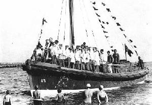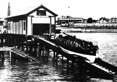 During the War Most of the East coast piers had been built with the object of providing means of landing passengers, and it was necessary to ensure that invading forces could not take advantage of such facilities. Southend Pier had been taken over by the Navy even before the declaration of war and became the headquarters of the Thames and Medway Control, but other piers were breached in order to render them useless. Clacton pier was blown up without warning while the lifeboat Edward Z Dresden was in her boathouse and considerable damage was done to the lifeboat and her equipment. After that the station had to be closed for a couple of months while the lifeboat went to Rowhedge for repair, and then the lifeboat operated from Brightlingsea for three months. The Walton on Naze lifeboat just seven miles along the coast, which normally lay at mooring off the pier head (the only lifeboat in Britain to have permanent mooring in the open sea) was based in the Walton Backwaters for a time until it was decided to bridge the gap blown in the pier. The Clacton lifeboatmen had had experience of aircraft in distress during the first World War, but this was little preparation for the work that had to be performed during the 1939- 45 war. On the second day of 1939 the lifeboat crew turned out because a flying boat was reported to be in down in distress, but it was later learned that the aircraft was safely at anchor and the lifeboat was recalled by radio, and in July both Walton and Clacton lifeboats were called when an aircraft crashed between Walton pier and the Gunfleet lighthouse, but the pilot baled out and was picked up by an aircraft taking part in the search. In the next six years Clacton lifeboat were called out 29 times to search for survivors from crashed aircraft, but usually they found nothing, sometimes wreckage or a patch of oil was discovered but no sign of life. On one occasion in 1941 both the Clacton and Walton lifeboats, plus the motor boarding boat then at Walton, put to sea when a British fighter came down in the sea, but the pilot was rescued by a barge. A few days later the reserve lifeboat J.B.Proudfoot, which was then on duty at Clacton, picked up a Polish pilot from the sea after his bomber had crashed in the early hours of the morning. The lifeboat found the bomber's dinghy, but a search revealed nothing of the rest of the aircraft,s crew. In September that year the Edward Z. Dresden helped to rescue three men from a British bomber which had crashed on the Gunfleet. When the lifeboat arrived the airman were standing on the wing, but the water was too shallow for the lifeboat to approach, so the airman paddled towards the lifeboat in their rubber dinghy. They were picked up, not by the lifeboat, but by an air sea rescue launch from Brightlingsea, the lifeboat staying at the scene to help prepare for the recovery of the aircraft later. The Edward Z. Dresden went to Dunkirk with other lifeboats at the end of May 1940, working with the Walton boat in Dunkirk harbour.