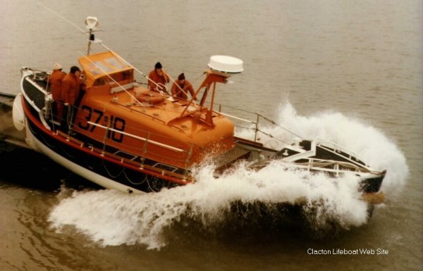 The new lifeboat arrived at Clacton on January 18th 1968. Due to the silting up at the end of the slipway, there had been occasions when the 46 foot 9 inc long Sir Godfrey Baring had been unable to launch and so in an attempt to get over this problem the RNLI had decided to station a smaller lifeboat at Clacton. The new boat was a 37 foot Oakley class self-righting, built by Herd & Mackenzie, at Buckie, at a cost of �37,000. The new lifeboat was launched for the first time on service at 13:50Hrs on February 4th 1968, after a small boat had been reported in difficulties off Jaywick. She was the cabin cruiser "Ginny" with three people on board, the boat's engine having broken down. The cabin cruiser was taken in tow to Brightlinsea and placed on moorings there at 15:30Hrs.
